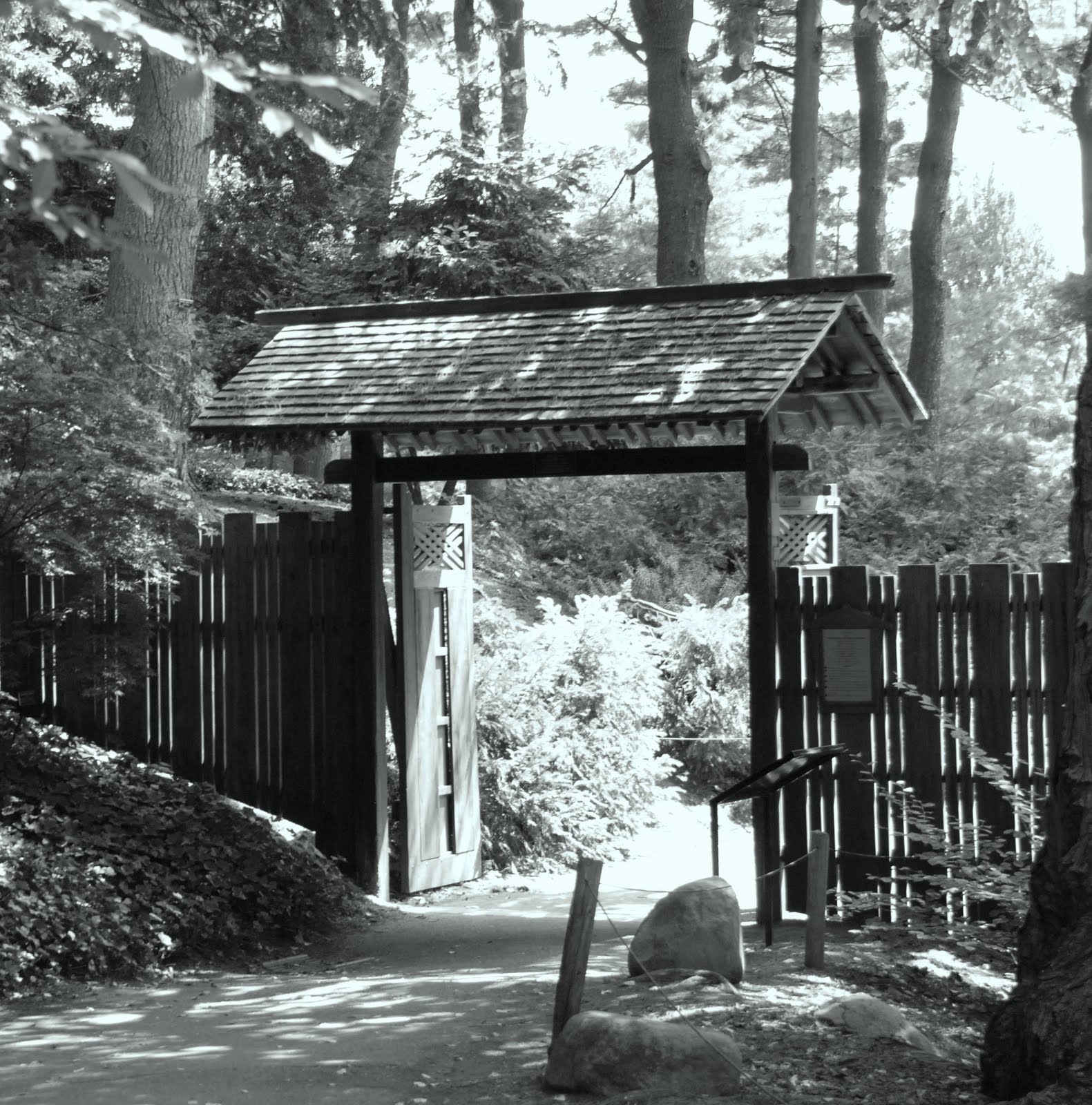 The path turned sharply right hiding from view the wooden gate, doors now ajar, that welcomed us into the Japanese Garden. As soon as I saw it I knew I wanted a black and white of it.