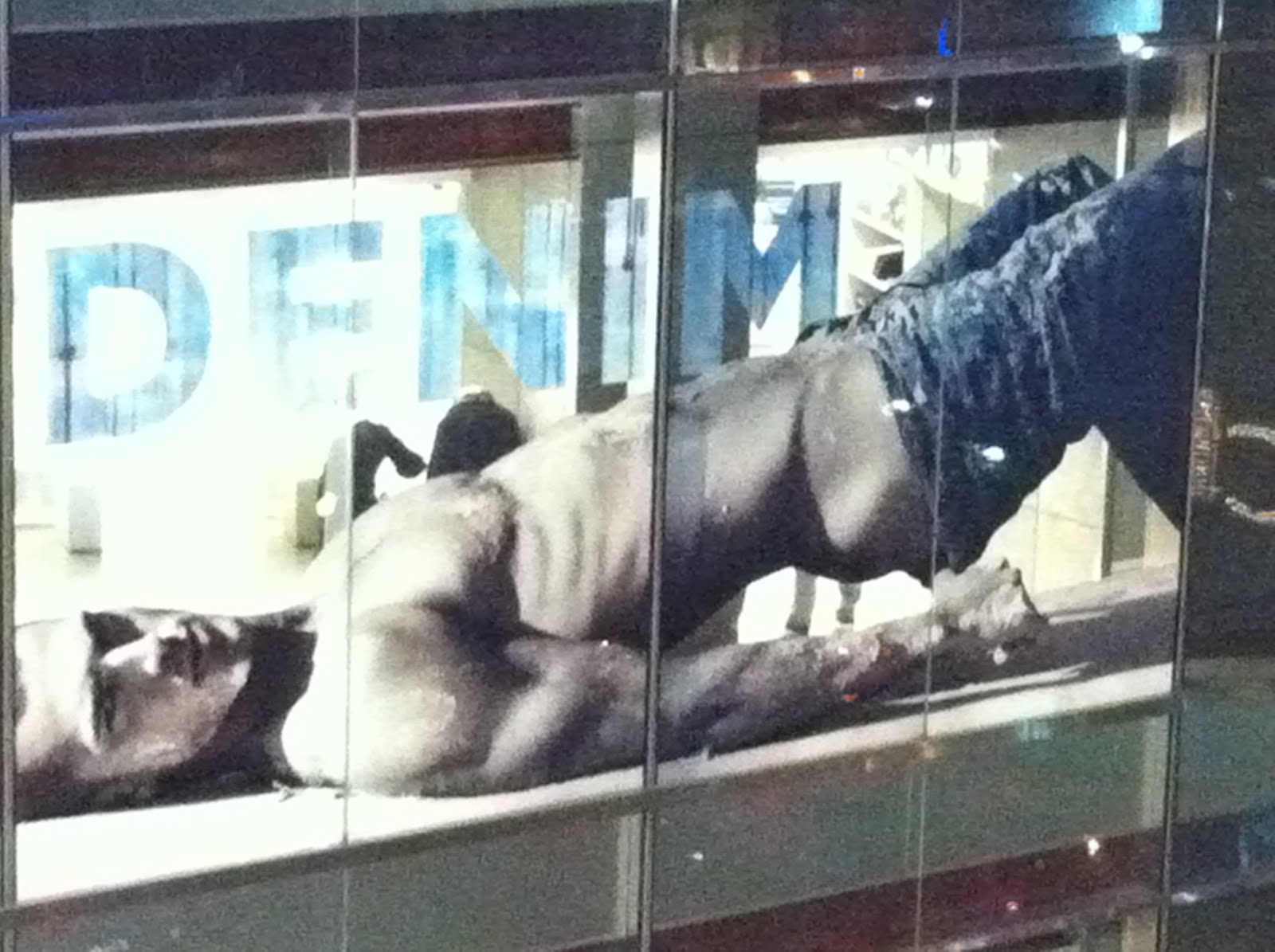 You are walking hands in hands with your partner and you notice she is looking at the huge sign taking three display windows. The sign shows a man wearing nothing but jeans, half his buttocks exposed. You already know when she likes something; and this she likes.