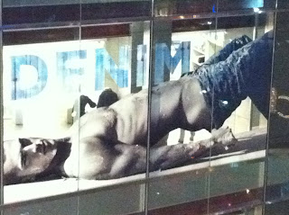 Should I care? Should I get jealous that this woman, walking right besides me, now wants a man that at present time is not even real. My brain tells me that I'm the idiot here if I even say something but being a man I am a bit reasoning deficient. So I ask... "What? You like him better than me?" Just as soon as the words come out I know, instantly, that I said something stupid. Yet I wait for an answer. I can't just apologize and move on. Now I have to meet her silence with another stupid comment. "Want me to drop my pants like that?" Even I know that the sight would be nothing like the man in the sign. Bless her heart for putting up with the extra pounds I carry. Now I'm hoping she says no because it would be embarrassing to pose like that man. I don't think I can do it even if I tried; I might get down but I'm not going to get up.